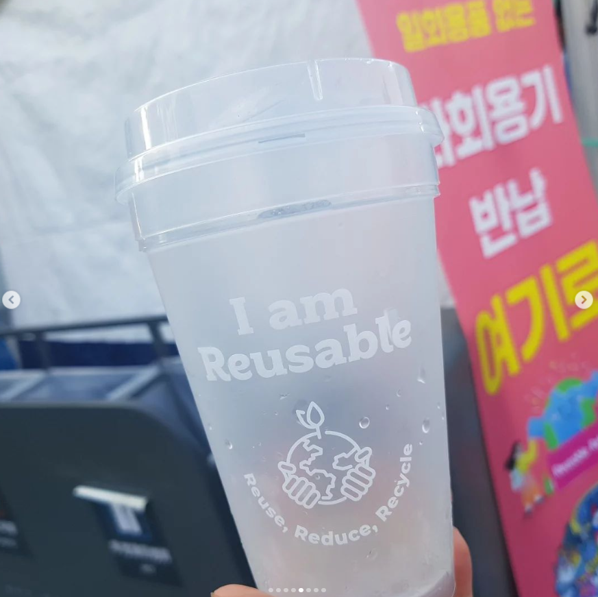 식품부스 접시나 포크는 일회용과 확연히 다른 외양이기에 그럴 일이 없지만, 음료가 제공되는 컵이 문제입니다. 일회용 테이크아웃컵과 흡사하게 생겼고 영어로만 리유저블이라고 써있기에 영어를 읽지 못하는 사람은 이것이 다회용기인지 아닌지 모를 수 있습니다. 글자 마저도 너무 흐릿하게 인쇄되어있어 디자인적으로 아쉬움이 있네요.