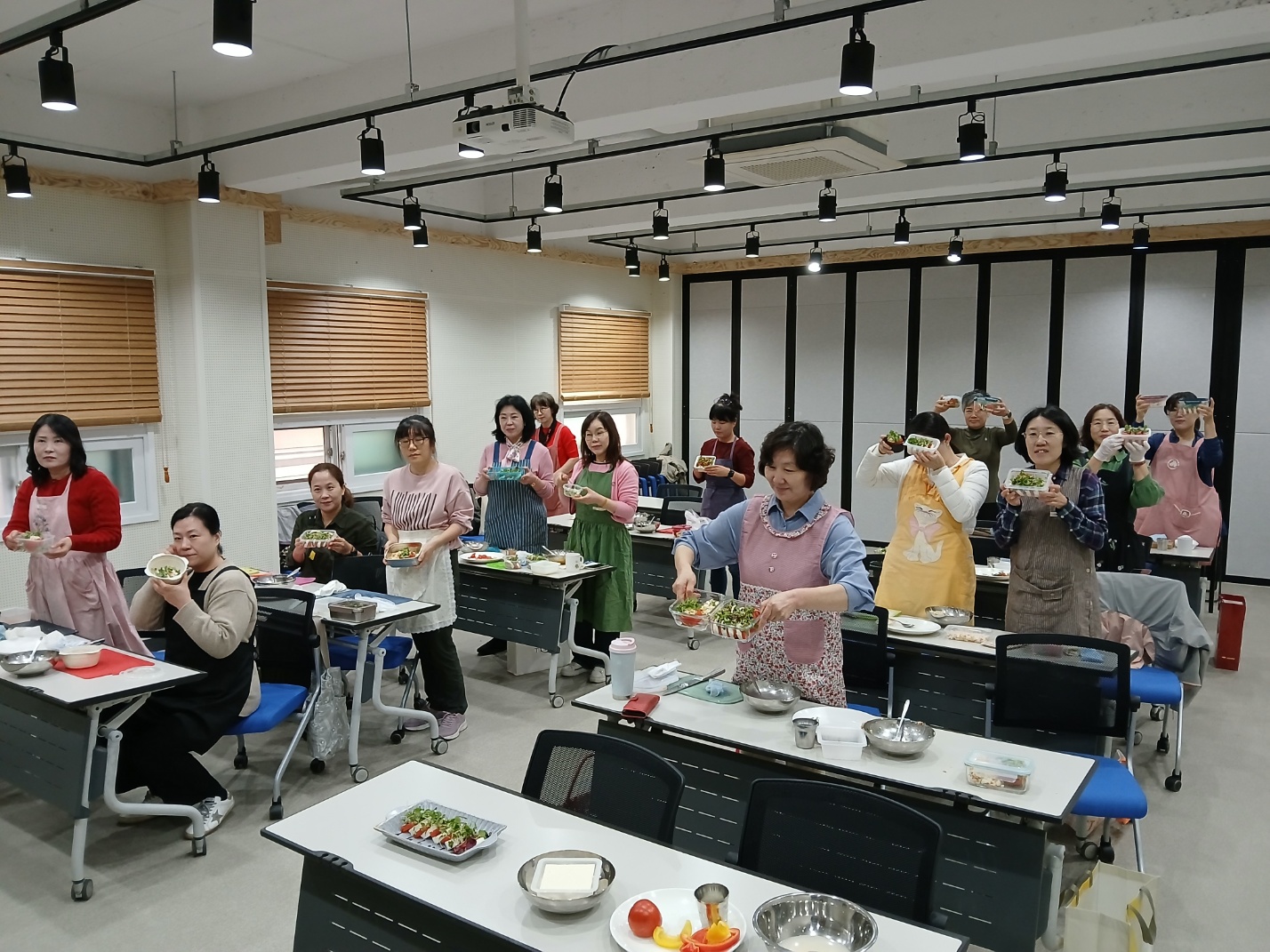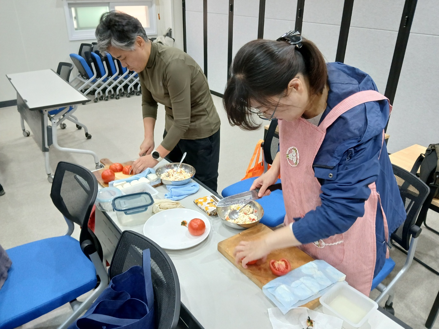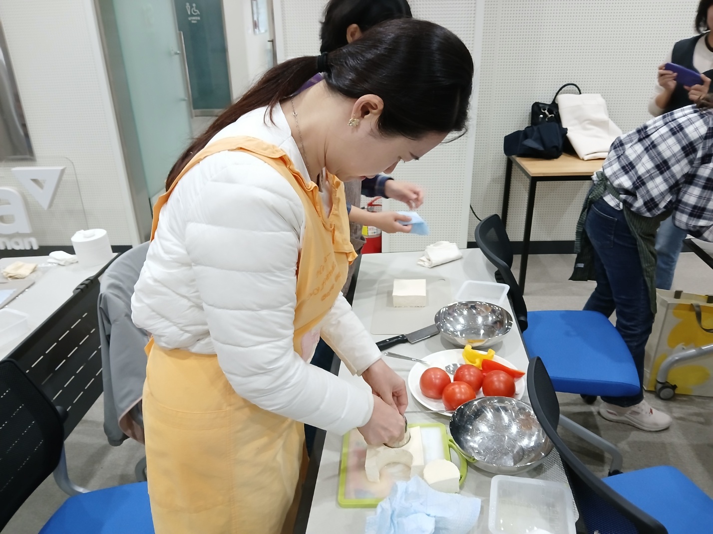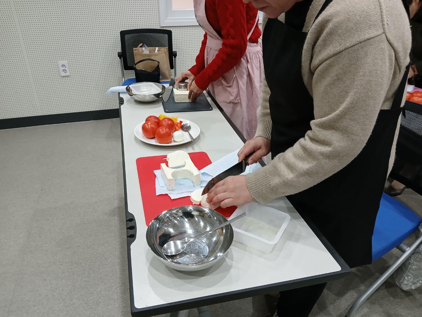 교육 후에는 치즈 대신 두부를 활용한 두부토마토카프레제와 샐러드를 직접 만들어보았습니다. 간편한 조리과정으로 건강과 미각을 모두 챙길 수 있는 채식 요리입니다. 덕분에 든든한 한 끼가 되었습니다.